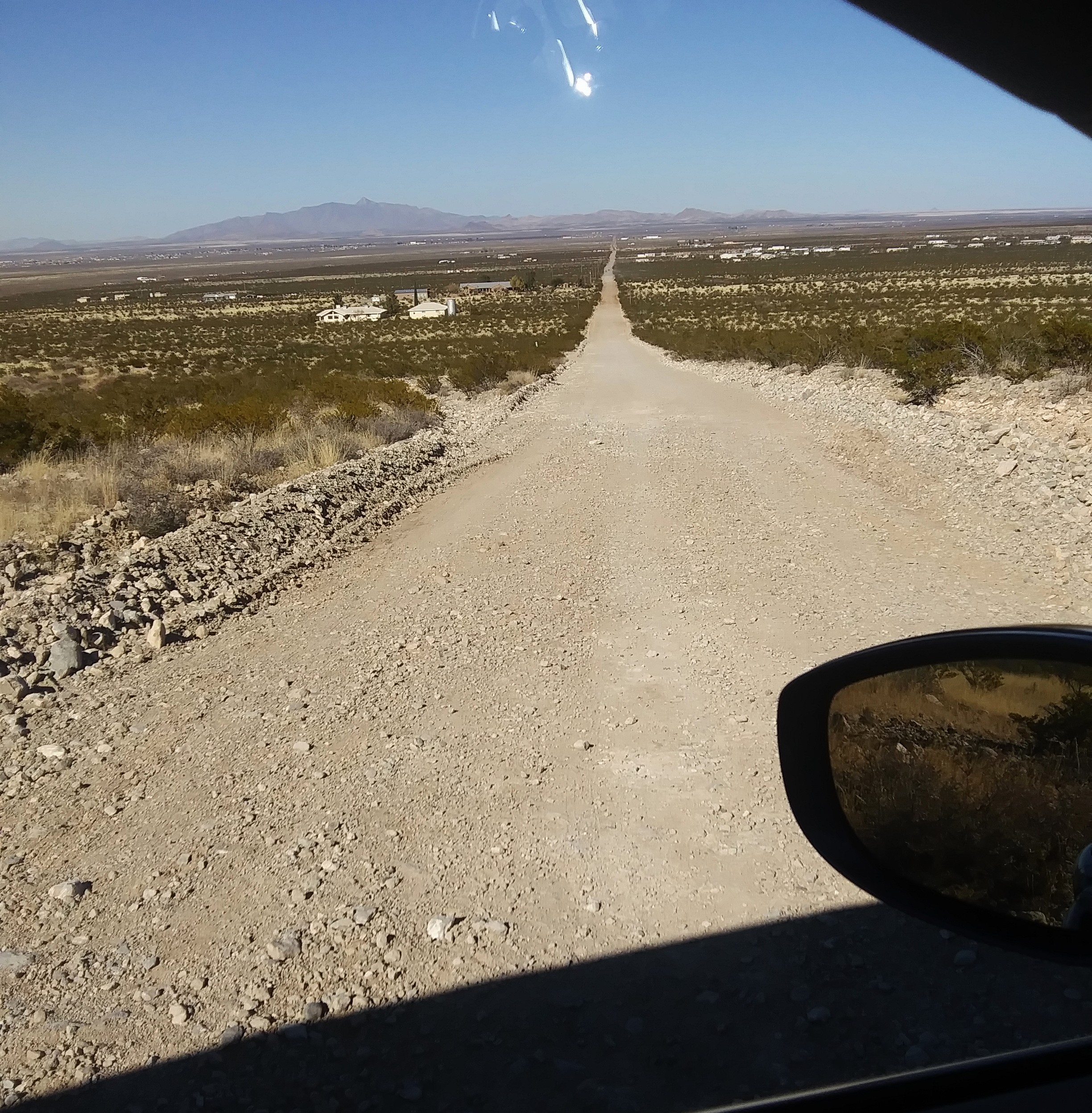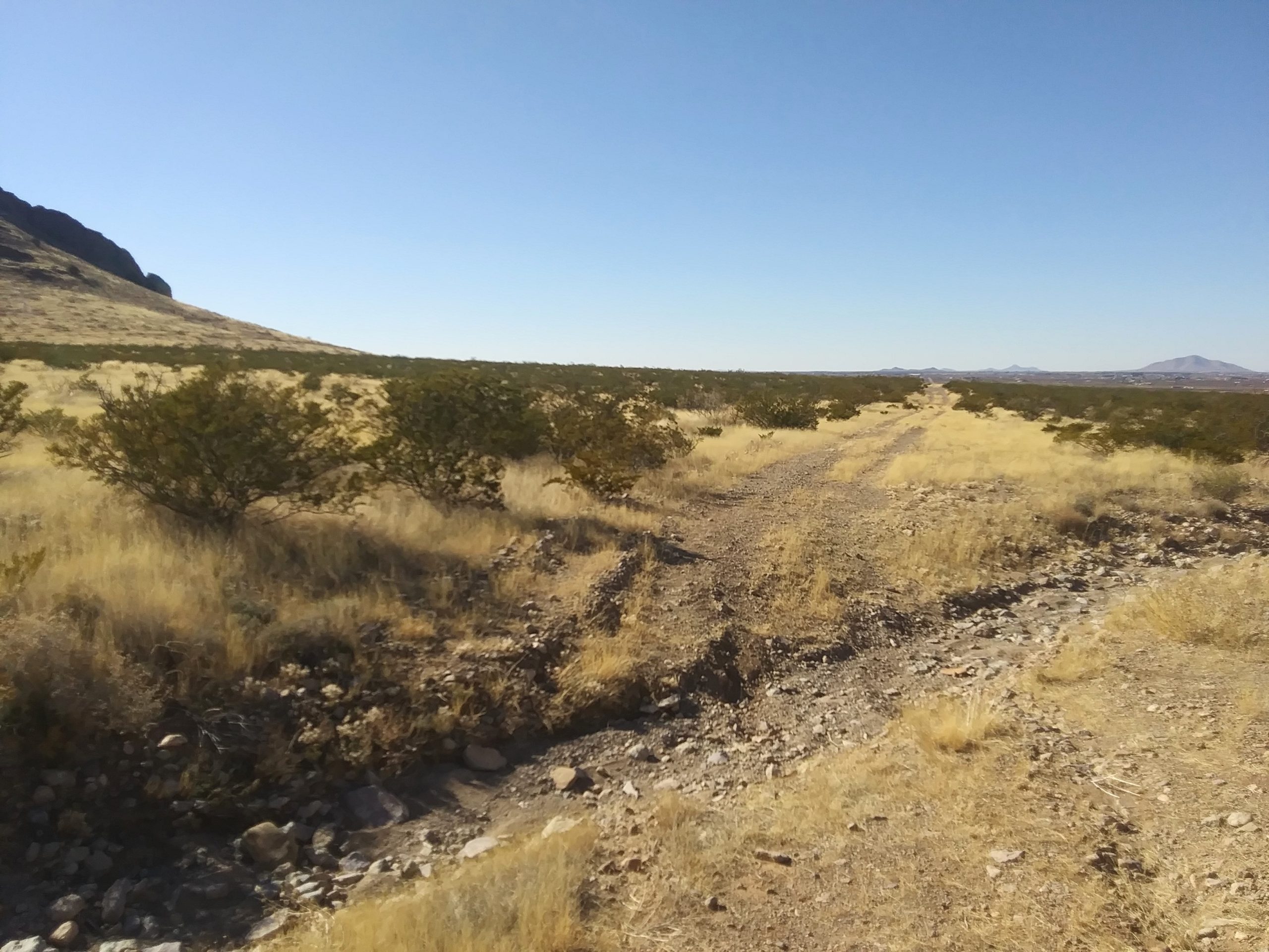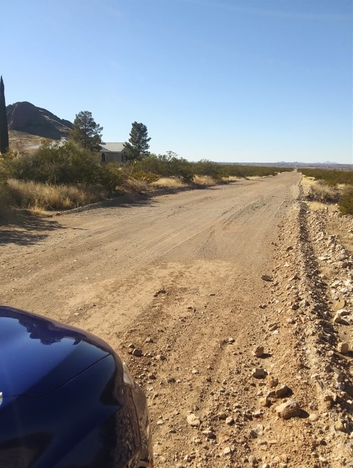 Beautiful view of the scenic mountains in the high desert! Lots of desert vegetation like creosote bush and cactus. There are some washes (arroyos) that pass through the dirt road and you need to pass with a high clearance vehicle or truck. A few miles there is a cowboy restaurant (Adobe Deli) that serves a delicious French Onion soup.